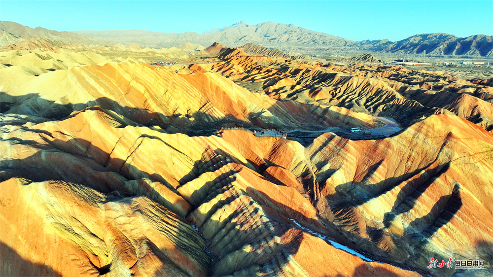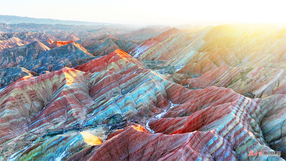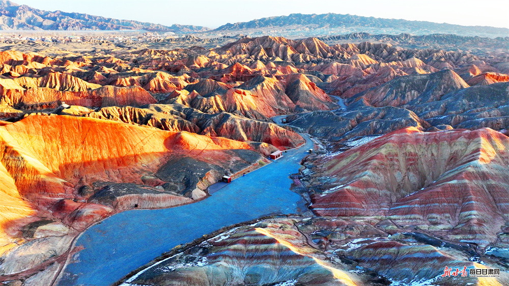 立春时节,张掖七彩丹霞原本浓艳的赤红更显炽烈,明黄愈发鲜亮,与青灰、墨黑的岩壁交相辉映,碰撞出“冰与火”交织的奇幻意境。