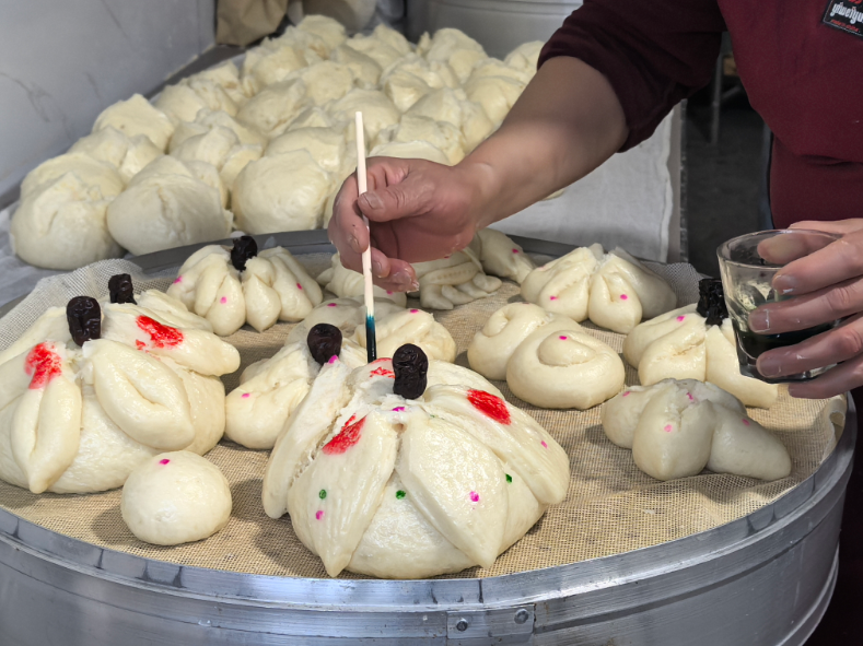 经过二十多分钟的蒸制,蓬松饱满的花馍便出锅了,贺吊香挨个缀上红枣,并用筷子点上红点和绿点。她说:“想吃一锅馍馍最少得等七八个小时,只有把面醒好、揉好,才能蒸出一锅蓬松暄软的馍馍。”