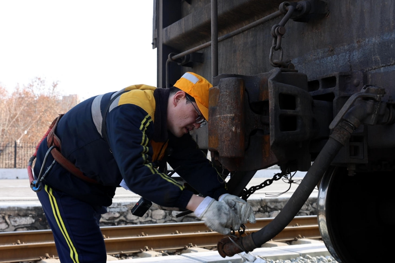 联系防护、横越线路、车辆连挂、撤除防溜、试拉启动……一系列操作有条不紊,一气呵成。列车缓缓驶向电厂,郭佳成的叮嘱也一路随行:“折返要道还道时确认好信号道岔,推进过程中加强瞭望,紧急情况立刻停车。”每一次电煤取送作业,都要耗时1小时40分到50分钟,每个班他们要在站厂间往返6到7次,在刺骨的寒风中,在冰冷的铁轨间来回穿梭,时刻保持高度警惕,避让往来车辆,不敢有一丝松懈。