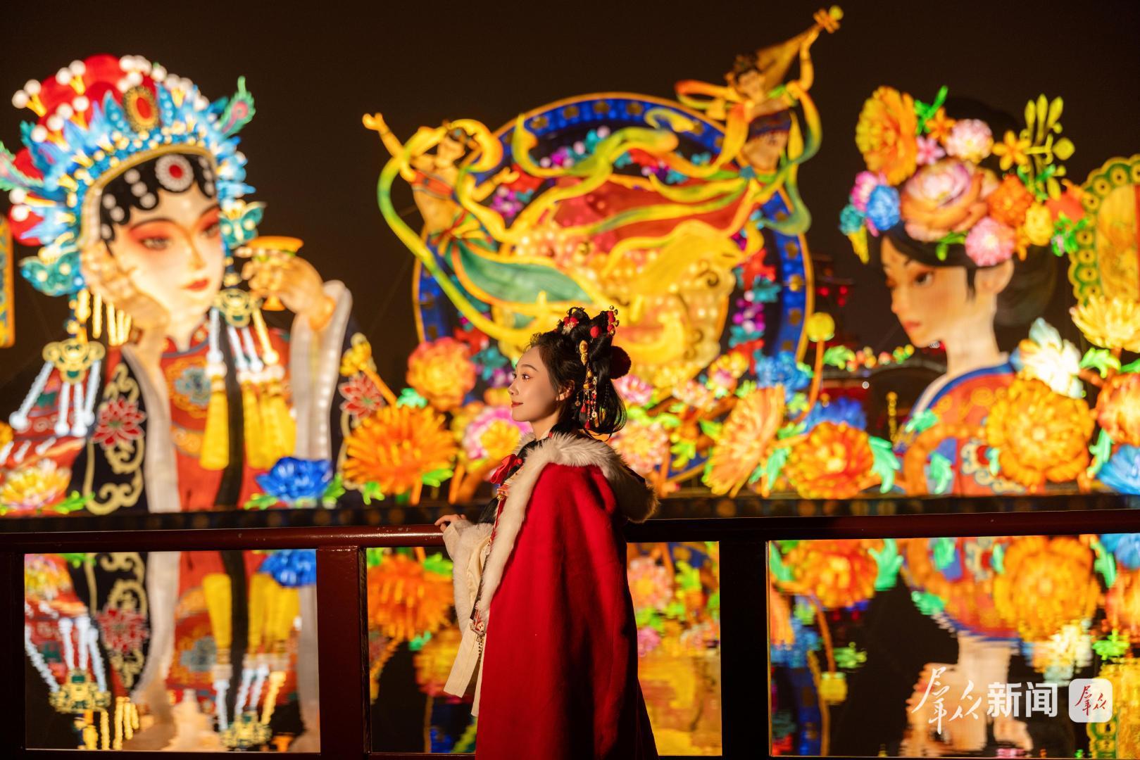 游客身穿汉服在“长安灯会”拍照打卡。