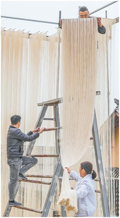 村民晾晒手工挂面。