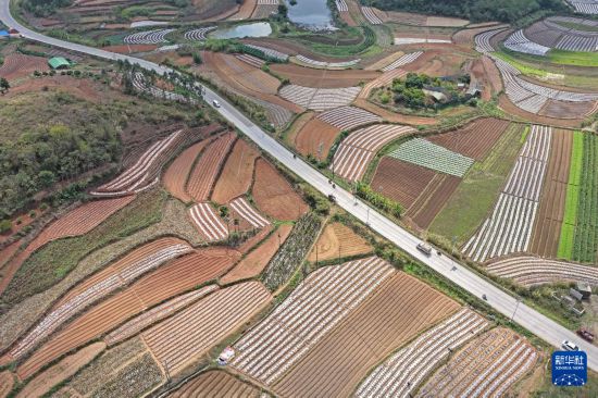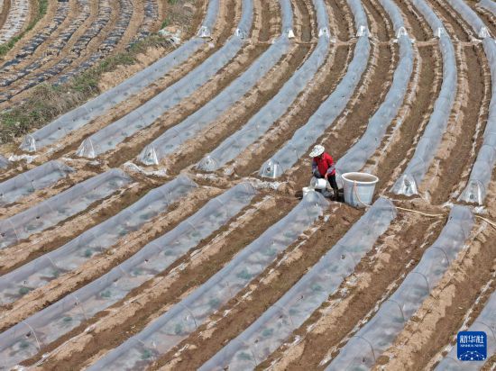 3月1日,村民在广西南宁市邕宁区蒲庙镇田园里耕作(无人机照片)。