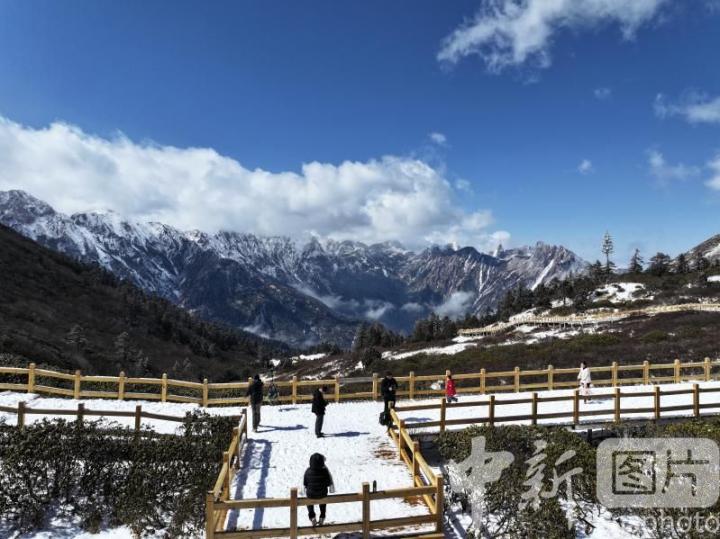 2026年3月1日,游客在甘肃省陇南市宕昌县官鹅沟景区雷古山欣赏雪景。当日,甘肃省陇南市宕昌县喜降瑞雪,春雪将官鹅沟景区装扮得银装素裹。中新社发 宕昌刘辉 摄