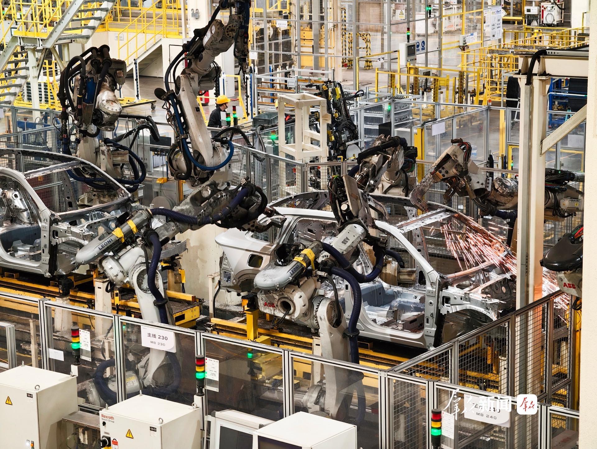 934台焊接机器人作业,完成车身焊接组装与四门两盖的装配调整;16台总拼机器人同时开展下探式焊接和自动换电极帽等工序,焊接工序自动化100%……目之所及,机器人成为生产制造中的绝对“主角”。