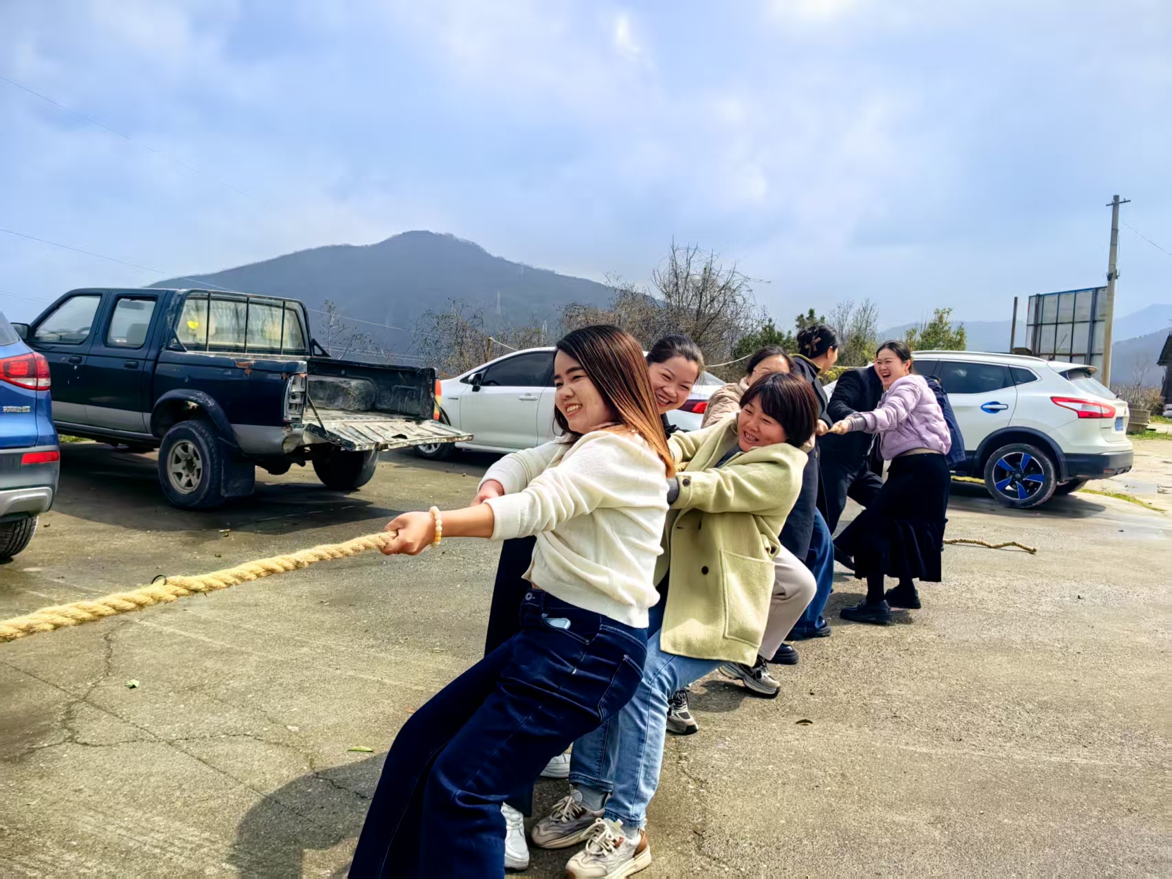 在大石村东茂山楂园,女干部们参观了新建的旅游民宿,细细品味传统住宅的特色装修风格,并在网红打卡墙前合影留念。参观结束后,趣味运动会在园区合作社正式拉开帷幕。