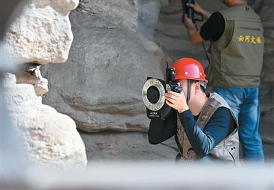 云冈研究院工作人员在云冈石窟进行数字化信息采集。