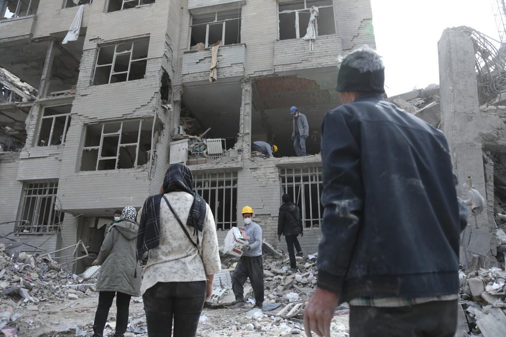 3月12日,在伊朗首都德黑兰,市民从损毁的建筑里搜寻生活用品。新华社记者 沙达提 摄