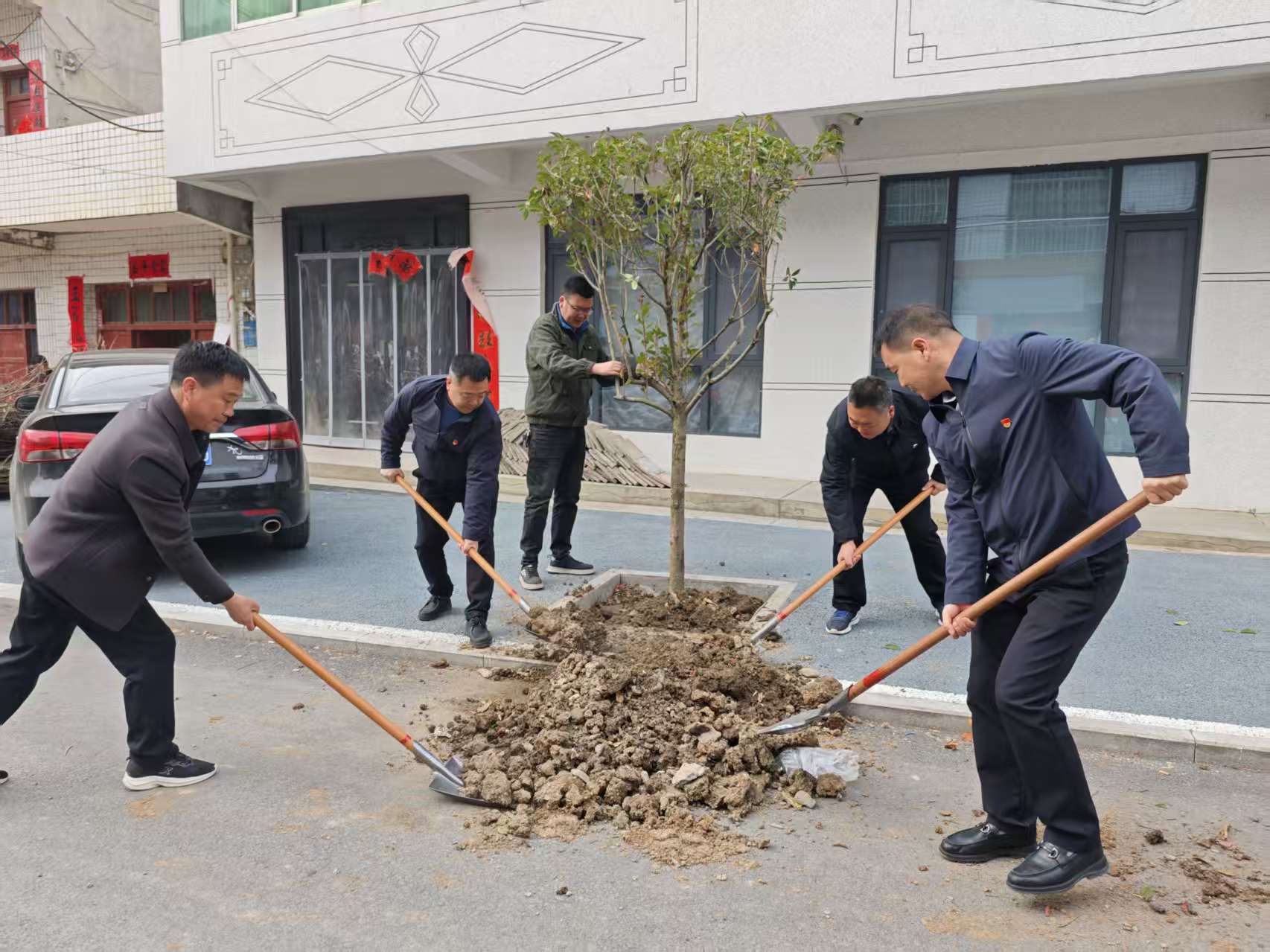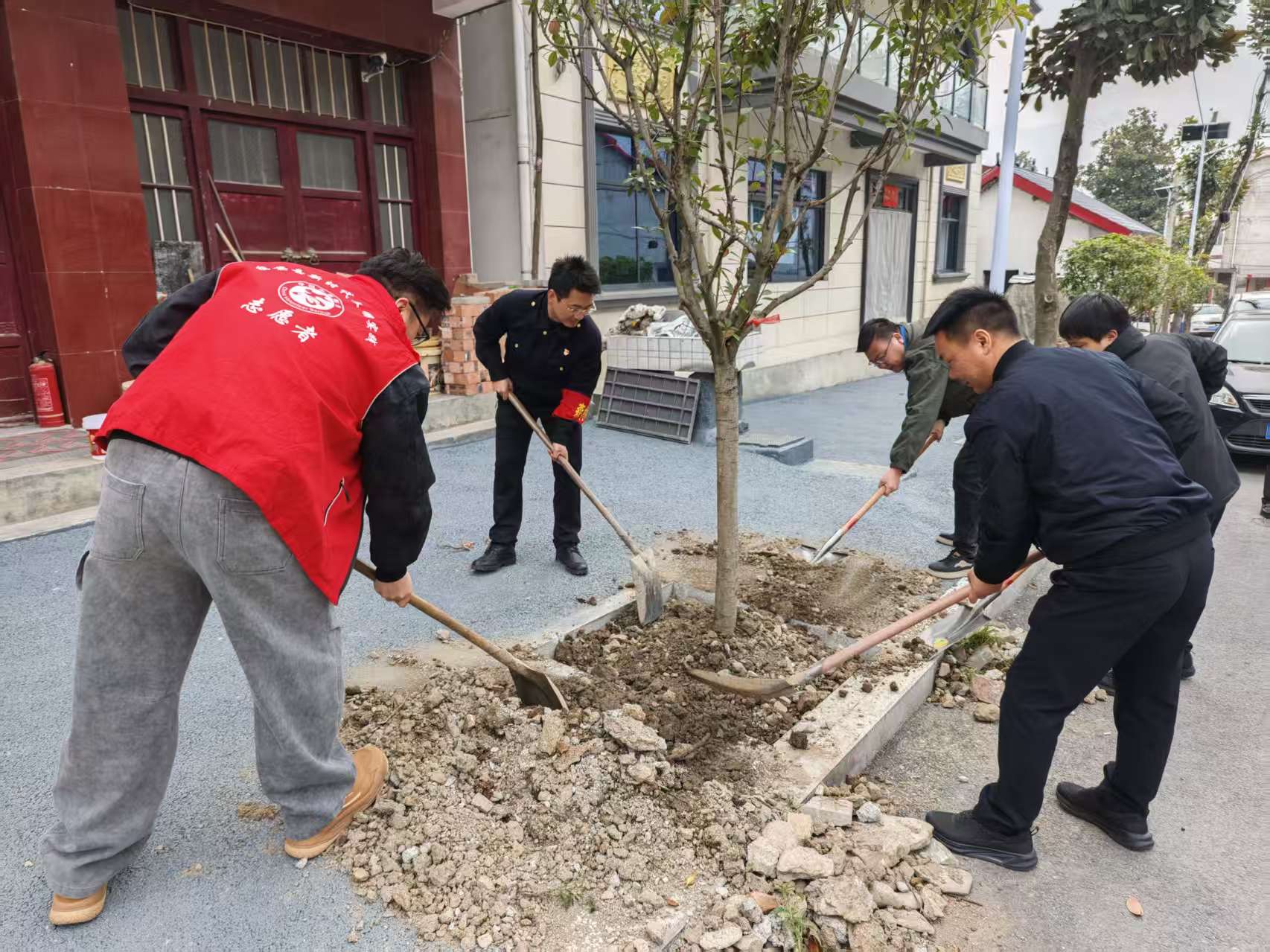 活动现场,红马甲与初春的绿意交相辉映,构成一道动人的文明风景线。大家分工明确、协作无间,挥锹铲土、扶苗定植、填坑踩实、浇灌培土,每一个环节都严谨细致、有条不紊。现场一派热火朝天、生机盎然的忙碌景象。一棵棵新栽的苗木迎风而立、错落有致,不仅为灵龙街道注入了蓬勃生机,更展现出米粮党员干部团结协作、担当实干的精神风貌。