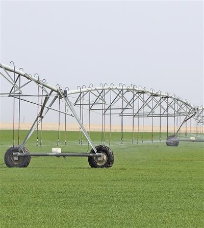 从高空俯瞰,圆形麦田似钟表的表盘,长长的喷灌机犹如指针,以支座为轴缓慢地做匀速圆周运动。