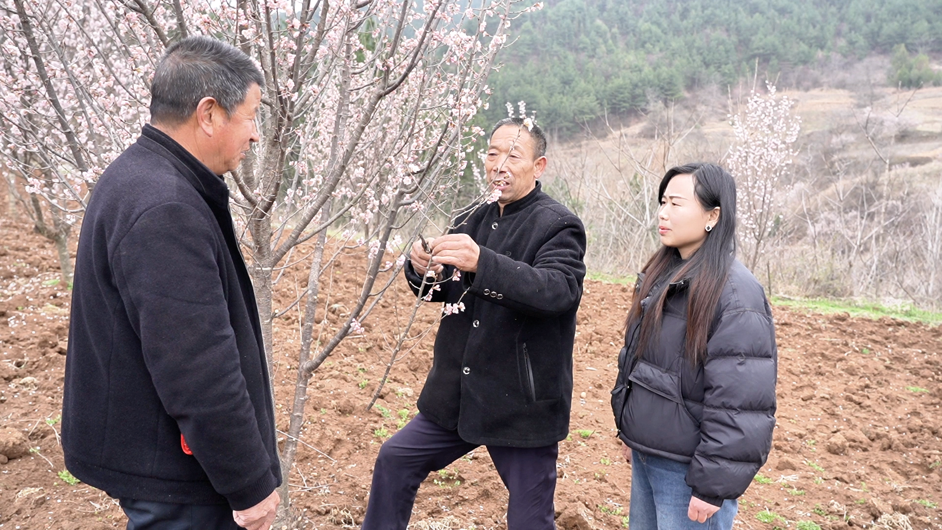 花开正艳,管护正忙。在樱桃园里,62岁的村民刘来成正忙着为村民讲解春季樱桃树科管技术。他一边修剪枝条,一边向大家细致讲解:“这花离树太近,是多余枝,结果后一刮大风,樱桃就被打青了,没有用,所以要及时剪掉。”