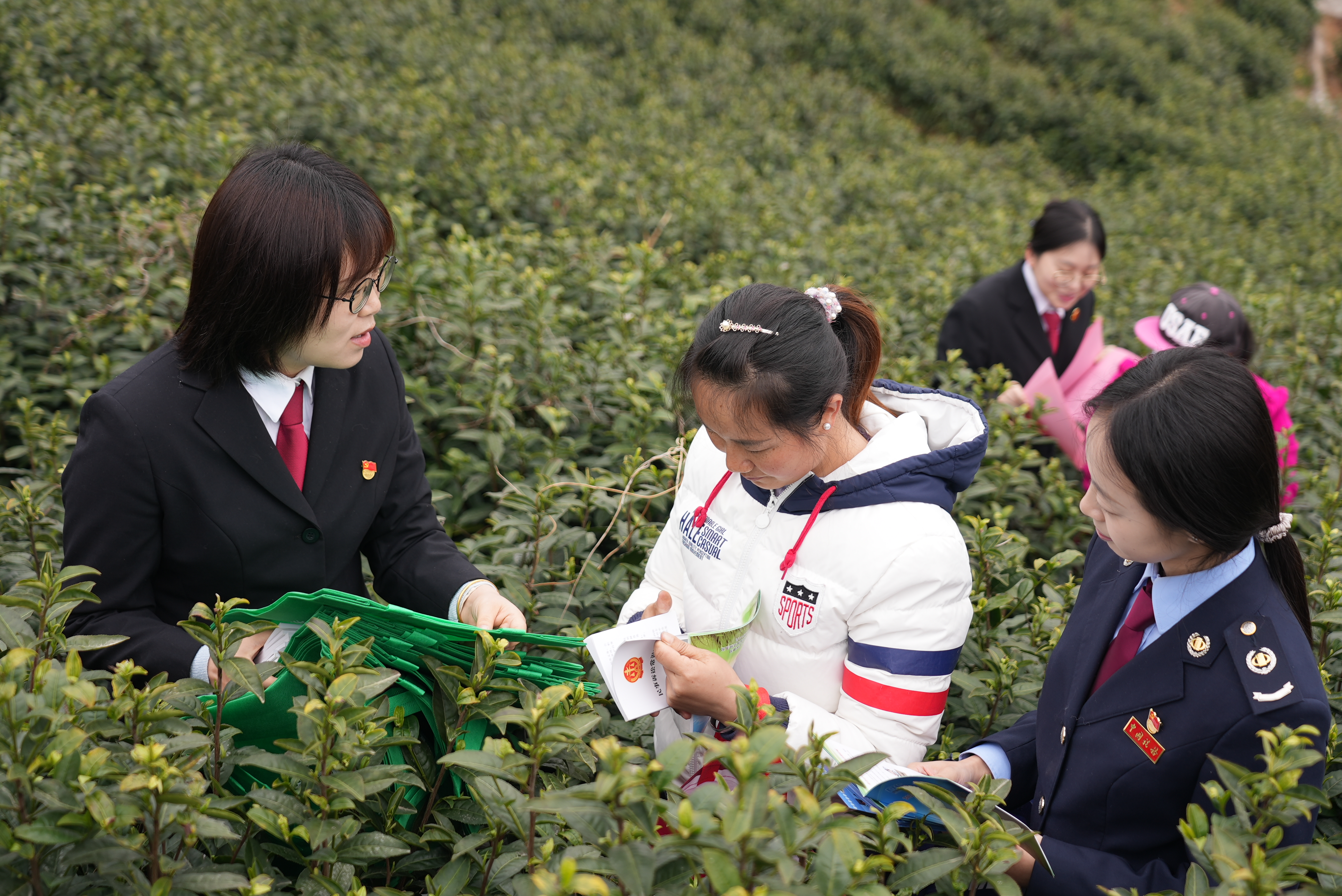 参观完“一杯茶调解室”,看到茶农们正在采摘新茶,两支部同志就地开展了送法入茶园普法宣传活动,法庭支部干警一边向茶农发放《民事诉讼常识100问》,一边与茶农亲切交谈“今年的采茶收入怎么样,工资都能按时发放吗,生活中要是遇到任何法律难题都可以来法庭找我们”“现在的司法服务也太接地气了,没有想到法官还能到茶山上给我们普法”,正在采茶的茶农张阿姨笑着感慨道。税务局同志也就城乡居民医疗保险及社会养老保险申报缴纳知识向茶农们做了宣讲。
