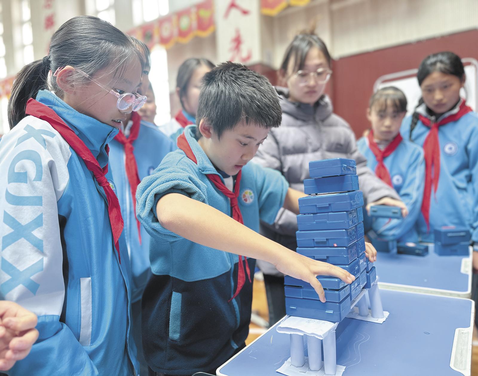 3月30日,西宁市城中区第二届中小学科技创新周在华罗庚实验学校西宁分校圆满落幕。本届科创周以培育新时代科创少年为核心,于3月23日启动,历经层层选拔,精心设置科学实践探究、科技创新发明两大核心类别,打造沉浸式科创比拼平台。本次活动为期一周,近万名中小学生踊跃参赛、从容竞技,本届科技创新周以赛促学,为区域中小学科创教育提质增效、培育高素质创新型后备人才筑牢坚实根基。图为纸桥设计搭建比赛学生正在进行纸桥承重。记者 刘祎 通讯员 王媛 摄