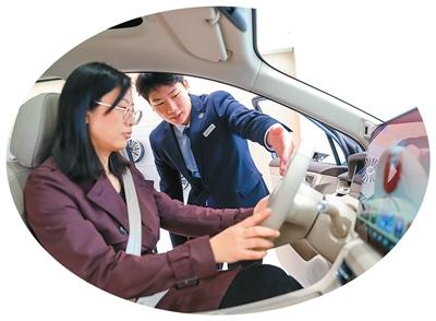 山东省青岛市李沧区乐客城华为智能生活馆内,消费者正试乘新能源汽车,工作人员向消费者介绍包括辅助驾驶在内的新能源汽车功能。