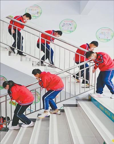 山东省滨州市惠民县孙武街道中心小学,学生参与防火灾安全疏散演习。