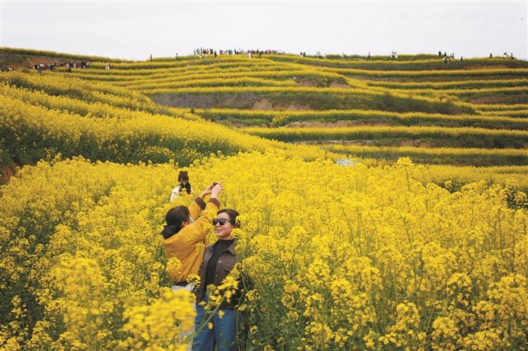 三原县大程镇小王村千亩梯田油菜花竞相绽放,吸引众多游客前来踏青赏花。图为3月29日,游客漫步田埂,尽享田园风光。 本报记者 许奥博摄