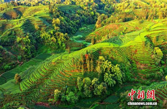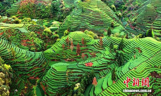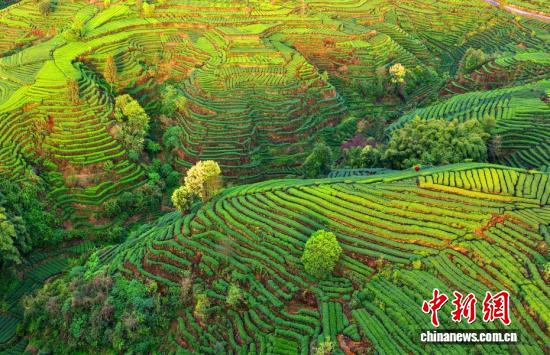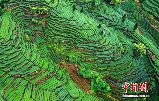 3月31日,在四川省雅安市名山区红星镇长岗山茶园,层叠茶垄如大地指纹舒展,美不胜收。中新社记者 安源 摄