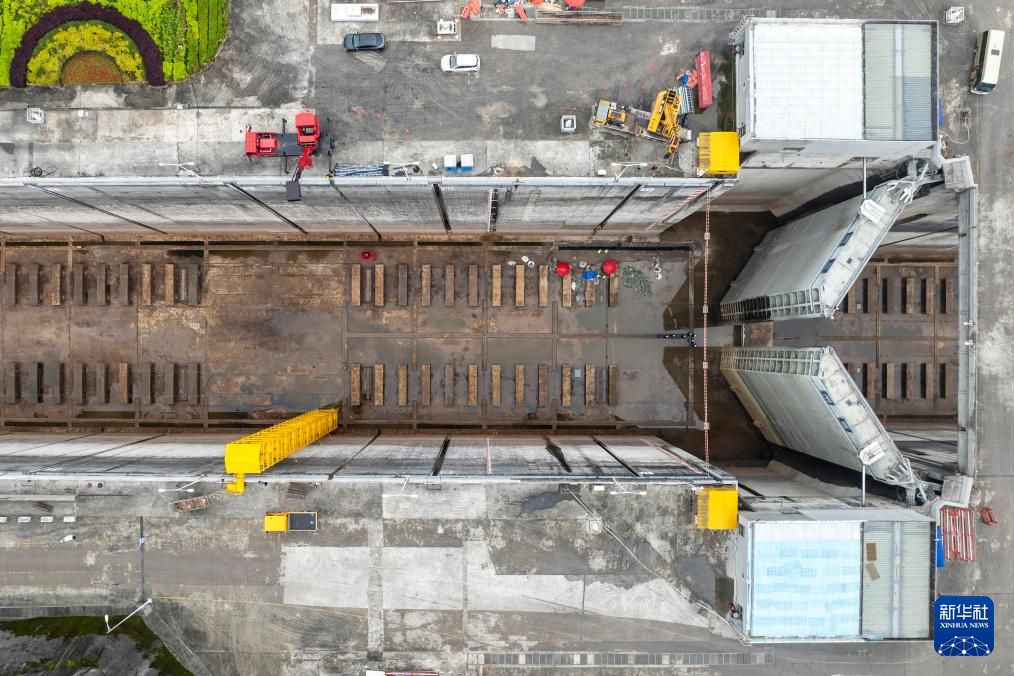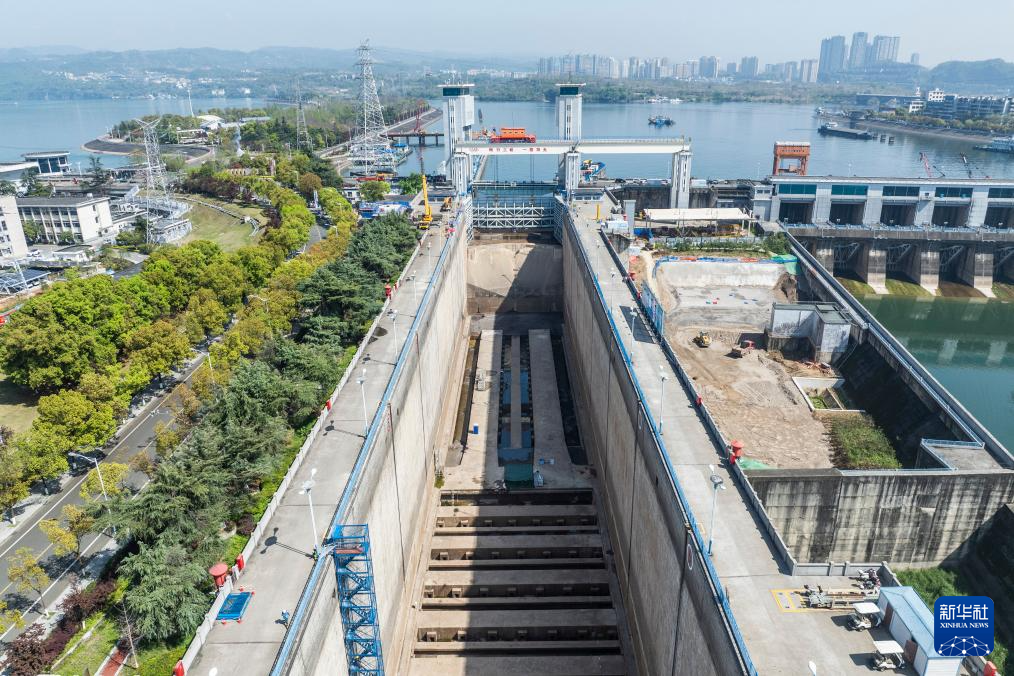 4月2日拍摄的三峡南线船闸停航检修现场(无人机照片)。新华社记者 伍志尊 摄