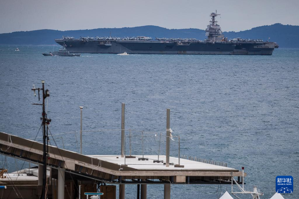 4月2日,美国海军“福特”号核动力航母离开克罗地亚斯普利特港。新华社发(Pixsell图片社/兹沃尼米尔摄)