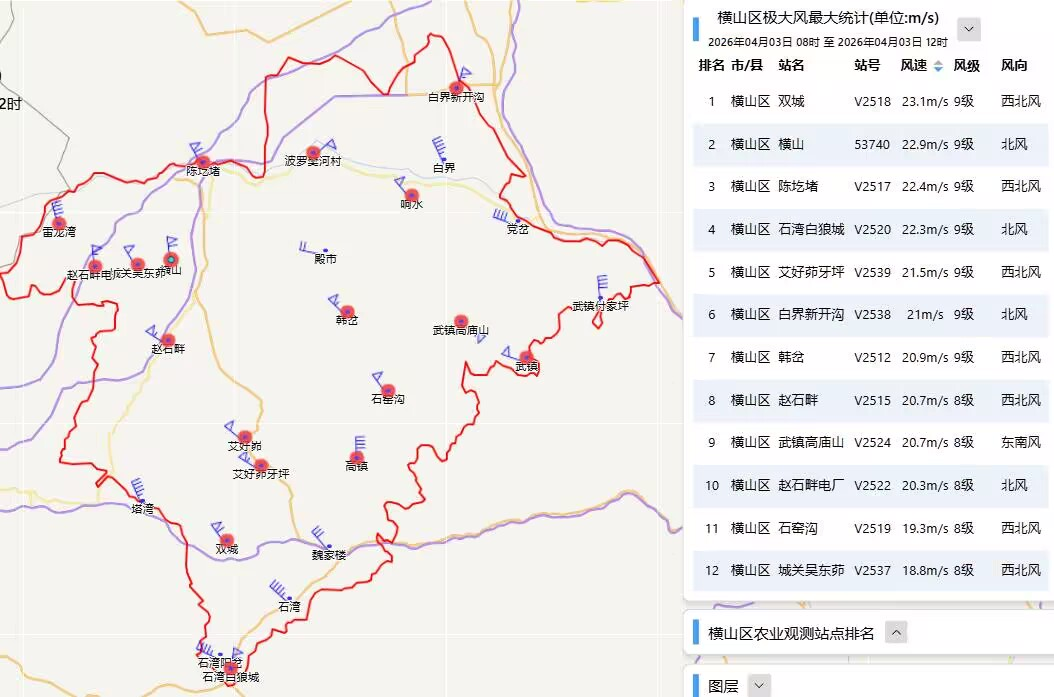 本报讯(通讯员 陈宇 李明霞)清明来临,横山区森林草原火险等级持续高位运行。据最新气象监测数据显示,4月3日08时至12时,横山区多地出现9级大风天气,双城、横山城区、陈圪堵、石湾白狼城等站点最大风速达21m/s以上,大风天气进一步加剧了森林草原火灾防控的严峻性。