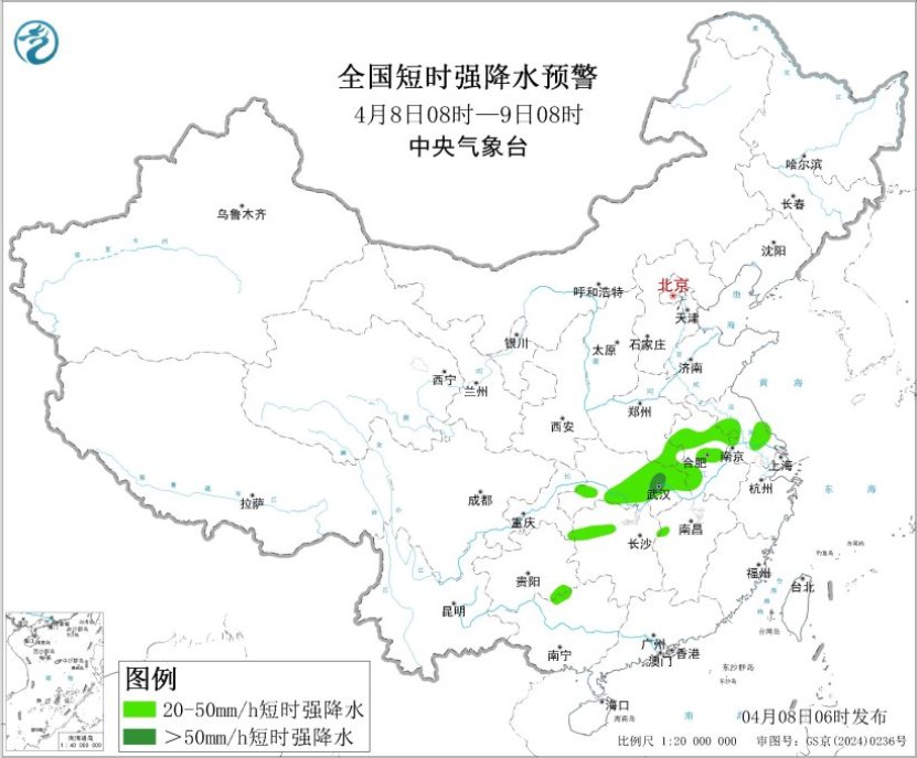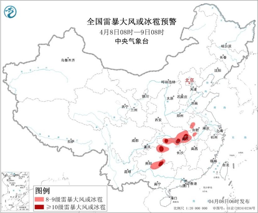 中央气象台4月8日06时发布暴雨蓝色预警、继续发布强对流天气蓝色预警。预计,4月8日08时至9日08时,湖北南部和东部、安徽中北部、河南南部、江苏中北部等地部分地区有大到暴雨,其中,湖北东部局地有大暴雨(100~150毫米)。上述部分地区伴有短时强降水(最大小时降雨量20~40毫米,局地可超过50毫米),局地有雷暴大风或冰雹等强对流天气。江汉、江淮西部、江南北部、西南地区东部等地的部分地区将有8级以上雷暴大风或冰雹天气,其中,湖北东部和南部、湖南西部、重庆东南部、贵州东南部等地的部分地区将有10级以上雷暴大风,最大风力可达11级以上;湖北东部和南部、安徽中北部、江苏中部、河南南部、湖南北部等地的部分地区将有小时雨量大于20毫米的短时强降水天气,其中,湖北东部局地小时雨量大于50毫米。