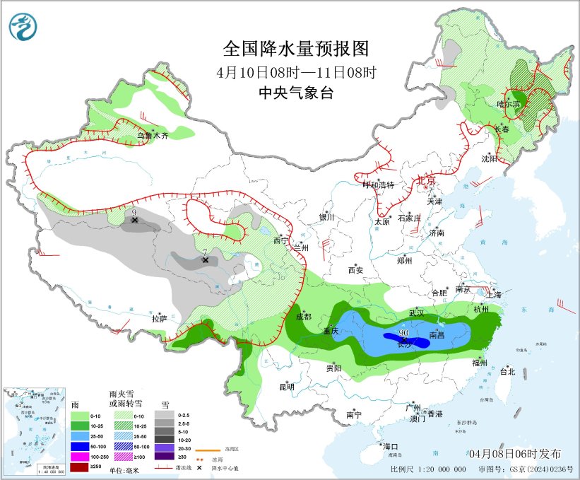 4月10日08时至11日08时,新疆北疆高海拔山区和南疆盆地、西藏北部和东部、青海大部、川西高原北部、内蒙古东北部、黑龙江、吉林东部、辽宁东北部等地部分地区有小到中雪或雨夹雪,其中,新疆南疆盆地、青海南部等地局地有大雪(5~9毫米);西藏东南部、云南西北部、四川盆地、重庆大部、贵州北部、江南大部等地部分地区有中到大雨,其中,湖南中部、江西西部等地部分地区有暴雨(50~90毫米)。内蒙古中东部、黑龙江东北部、辽东半岛、山东半岛、河北南部、新疆沿天山地区、西藏南部和西部、西北地区东部、苏皖南部等地部分地区有4~6级风;东海大部海域、台湾海峡、台湾以东洋面、北部湾、南海西北部海域有5~6级风,阵风7级。