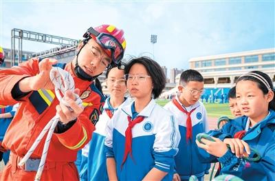 图为启动仪式现场,学生在消防救援人员的指导下,学习应急逃生中常用绳结的系法。