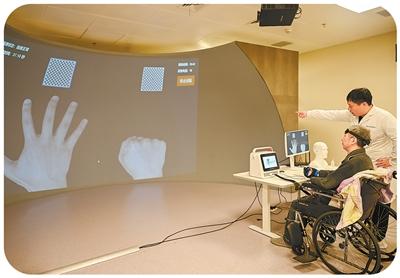 4月7日,贵州省贵阳市,北京积水潭医院贵州医院医生在指导患者进行脑机接口康复训练。