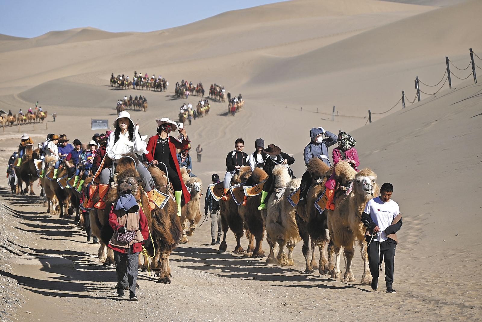 4月5日,游客在甘肃省敦煌市鸣沙山月牙泉景区骑骆驼游览。