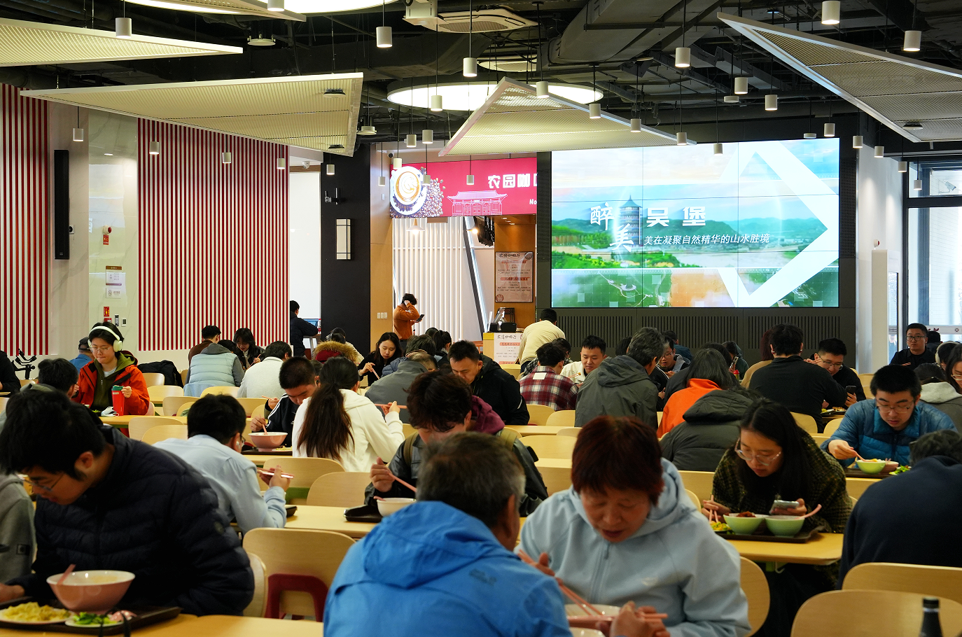 本次活动精选酸汤挂面、羊肉臊子挂面、西红柿鸡蛋挂面、鸡蛋爬粉条、酸菜捞饭、炒洋芋擦擦六道吴堡招牌美食,在两校区食堂开设专属特色窗口,于午餐、晚餐时段持续供应。作为吴堡非遗代表的手工空心挂面,细白如丝、空心筋道、久煮不烂,搭配鲜醇羊肉汤底、酸甜西红柿鸡蛋汤或是秘制酸汤,每一碗都藏着吴堡的千年匠心与黄河醇香;鸡蛋爬粉条软嫩咸香、酸菜捞饭酸香绵糯、炒洋芋擦擦筋道鲜香,六道陕北风味浓郁的特色菜品,让北大师生足不出校便奔赴一场舌尖上的黄土高原之旅,一经推出便吸引师生驻足品尝,食堂内排起长队,赢得阵阵好评。与此同时,食堂内全方位打造吴堡主题沉浸式氛围,剪纸艺术展板错落摆放,电视屏循环播放吴堡形象宣传片、挂面非遗技艺片等相关宣传片,让师生们在品尝美食的同时,全方位感受吴堡的文化底蕴与乡土温情。