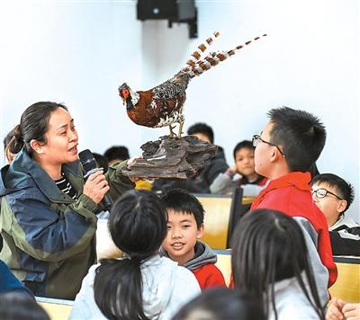 图为4月3日,江西官山国家级自然保护区的工作人员在向学生讲解珍稀野生动物的习性。