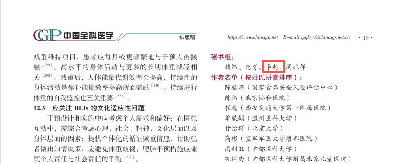 近年来,李超勤勉务实、锐意进取,以第一作者或共同第一作者身份在《Nutrients》等国际权威期刊发表SCI论文2篇,曾受邀在“一带一路”全球健康国际研讨会进行全英文汇报并获优秀奖,主笔的科普文章首登国家级《学生健康报》。此次以秘书组成员身份参与国家级指南编撰,意味着李超从全国众多青年科研骨干中脱颖而出,获得国内顶级专家团队的认可。秘书组成员是保障指南科学性与规范性的核心执行团队,承担着文献梳理、证据整合、多轮专家意见协调及统稿等关键工作,直接关系到指南的严谨性与权威性。此次参与,不仅是对李超个人专业能力与学术素养的高度肯定,更标志着二一五医院青年人才已具备与国家级顶尖团队协同攻关的硬实力。
