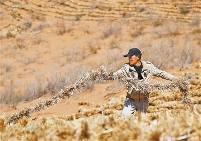 图为中卫市腾格里沙漠东南缘,治沙工人在铺设“刷状网绳式草方格沙障”。