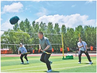 校园操场上传来阵阵欢呼声,毕洪兵正带着学生练习,草球在空中划出弧线,木叉精准扬起。不远处的文化广场上,尤卫萍的舞蹈排练刚结束,围观的老人、孩子还在学着比划投叉的动作。