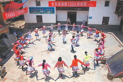 在大关县天星镇绿南村,苗族群众在接受芦笙舞蹈培训。