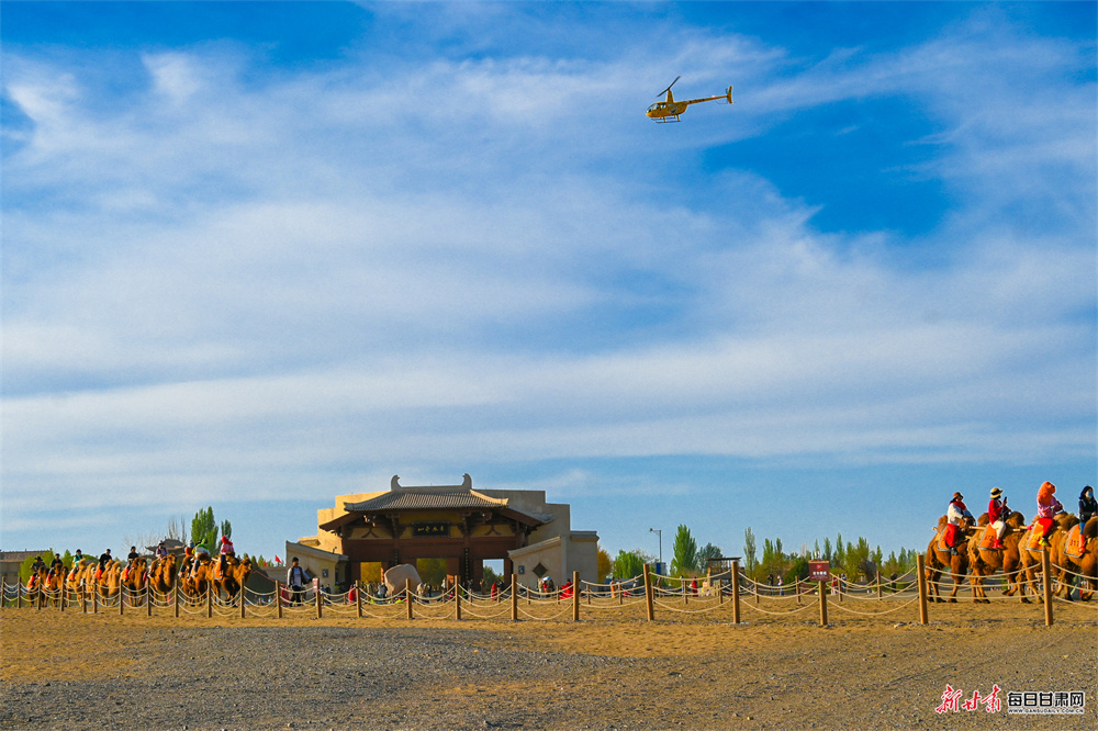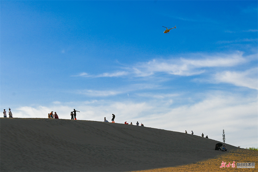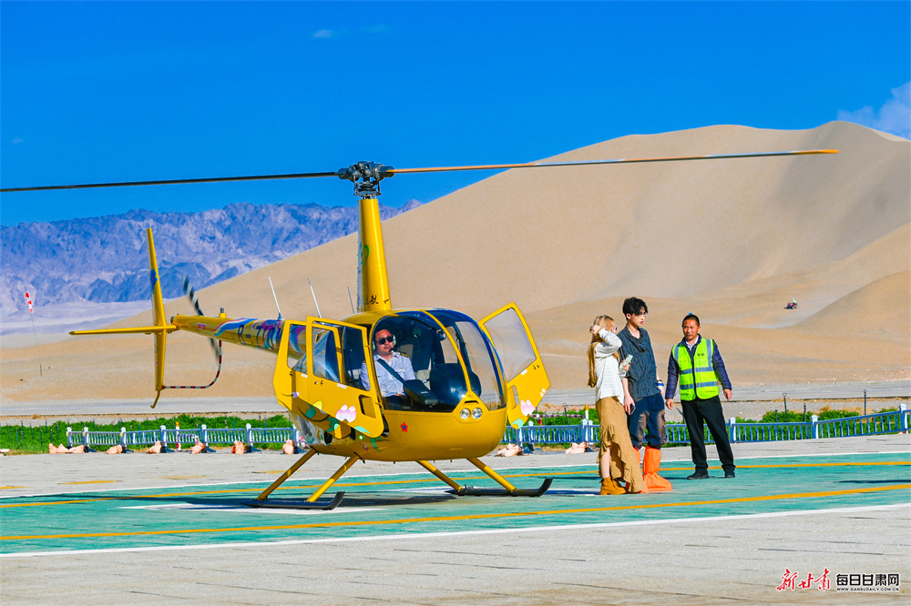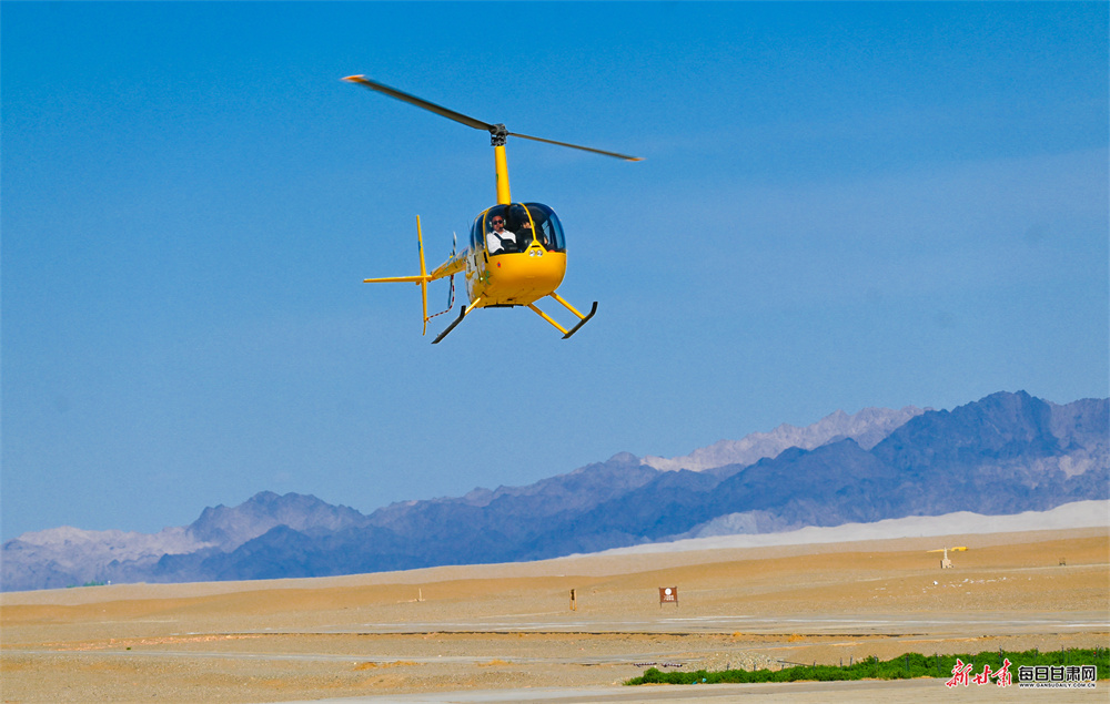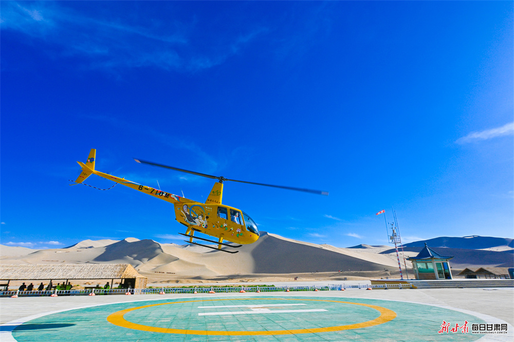 4月13日,敦煌鸣沙山月牙泉景区新增涂装直升机低空旅游项目,正式对游客开放。