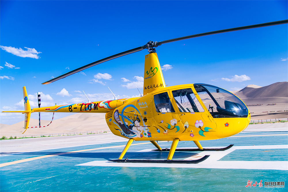 该直升机机身融合敦煌文化元素与特色涂装,与大漠风光相映成趣。游客可乘直升机从空中俯瞰鸣沙山、月牙泉全景,以全新视角感受丝路大漠壮美景观。