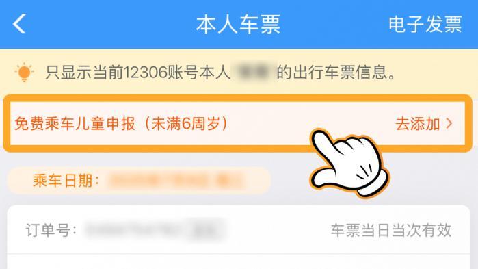成人旅客购票后,可以点击【订单】-【已支付】,也可以点击【本人车票】找到申报入口,点击【免费乘车儿童申报】添加免费乘车儿童即可。