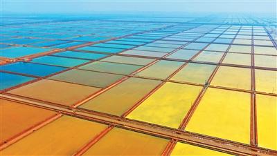近日,山东省滨州市沾化区春季原盐生产启动,机械化采收作业如火如荼,工人利用晴好天气机收春盐。图为沾化区滨海镇万亩盐场多彩盐田。