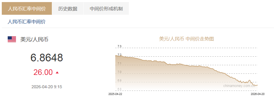 中新网4月20日电 据中国外汇交易中心网站消息,中国人民银行授权中国外汇交易中心公布,2026年4月20日银行间外汇市场人民币汇率中间价为:1美元对人民币6.8648元,下调26个基点。