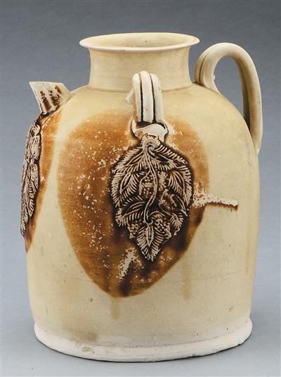 唐长沙窑青釉褐斑模印贴花椰枣纹执壶。