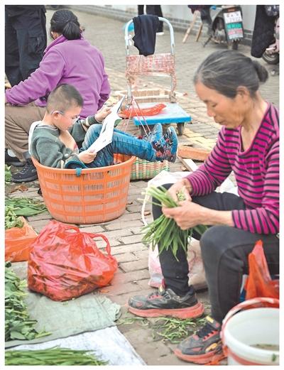 小朋友在江西省南昌市南昌县澄湖东路一菜摊旁阅读。