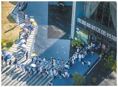 读者在江西省南昌高新区图书馆门前排队进馆。