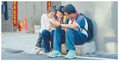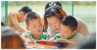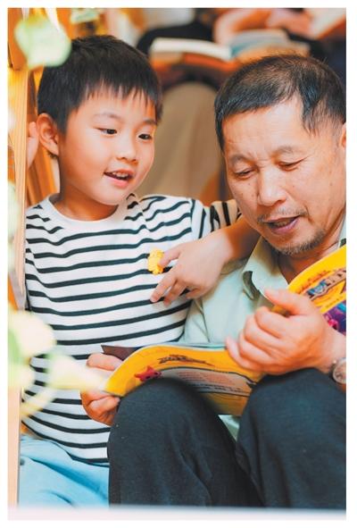 小朋友在江西省南昌市桃湖农民公寓前阅读。