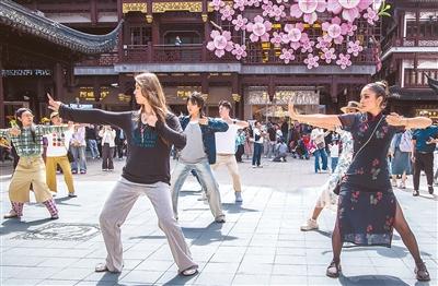 市民在上海豫园中心广场练习国家级非遗八段锦,外国游客加入一起学习,感受中国传统文化的魅力。