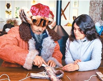 外国游客在新疆阿勒泰参与毛皮滑雪板制作体验。