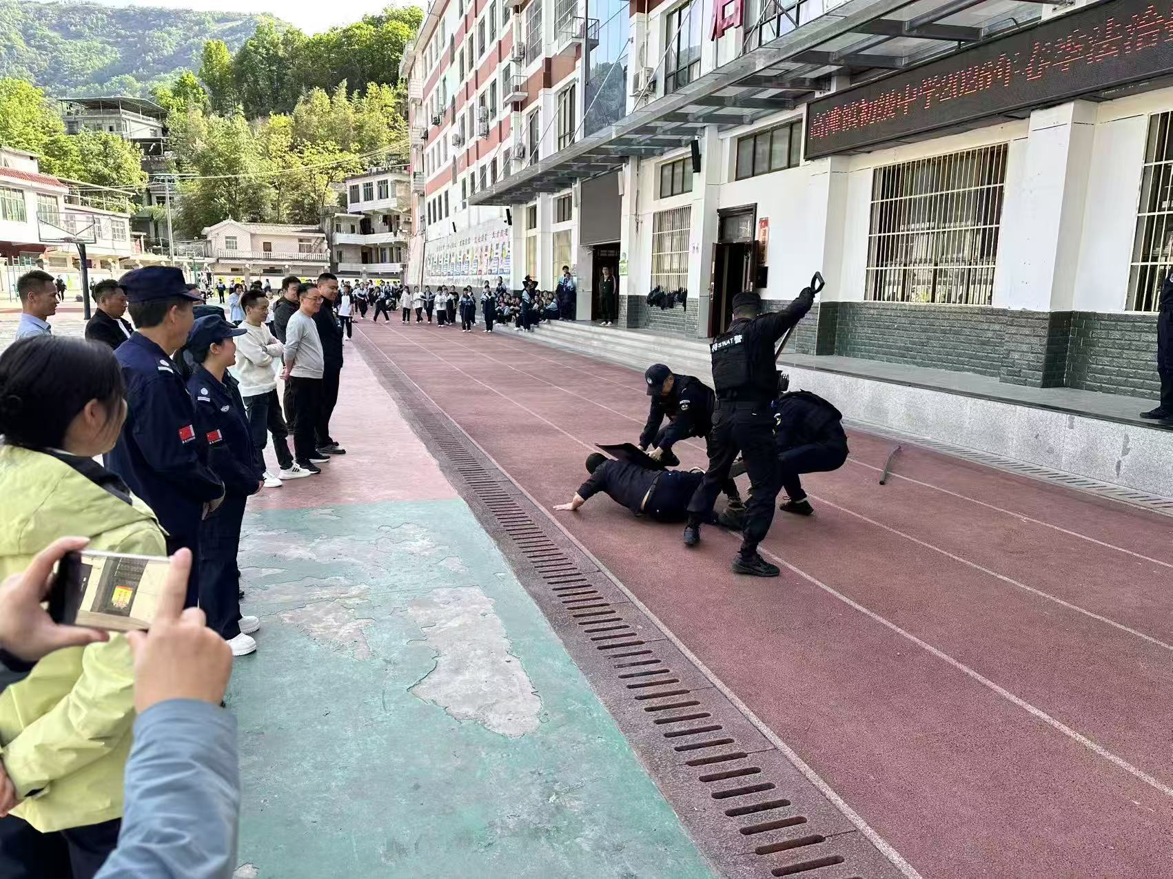 活动中,民警还现场展示了警用枪械、防护装备等警务器材,逐一讲解装备用途与安全常识,让师生近距离感受公安力量,增强校园安全底气。随后,防暴应急演练正式开展,巡特警民警现场演示防暴钢叉、盾牌等器械规范使用方法,模拟校园突发极端事件场景,指导教职工快速响应、规范处置。全校师生依照预案有序疏散、规范避险,演练流程紧凑、高效有序,切实达到以演促练、以练备战的目的。
