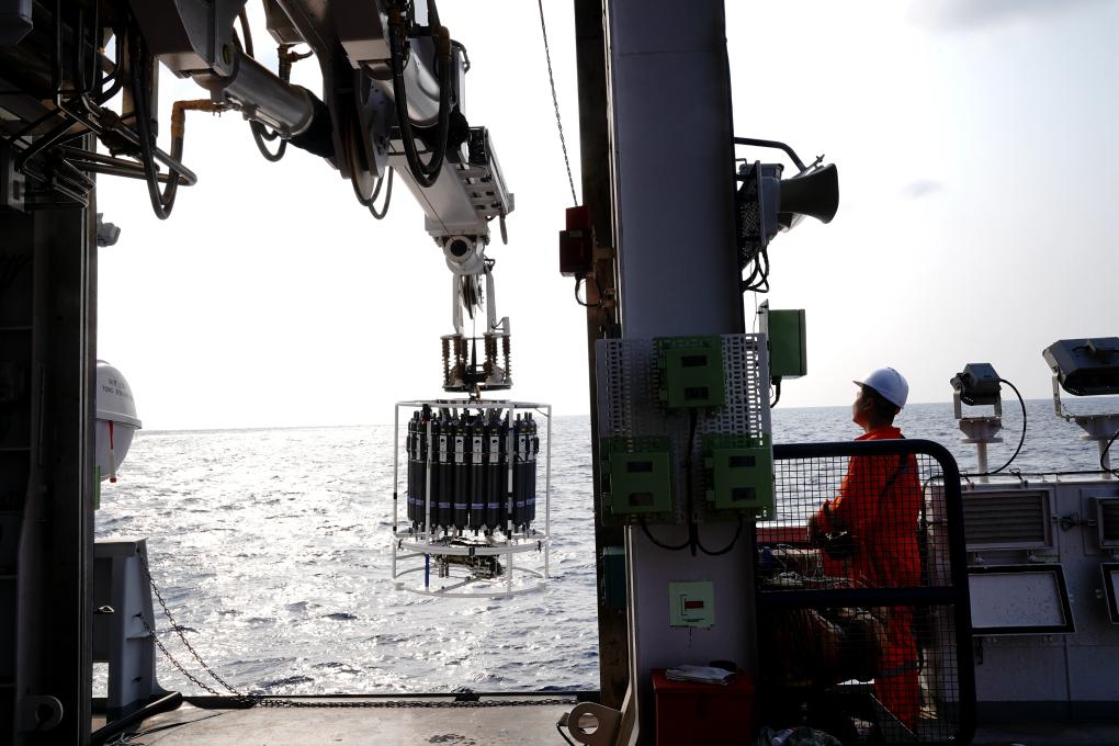 4月22日,“同济”号在南海施放CTD(温盐深仪)采集海水样品。新华社记者 张建松 摄