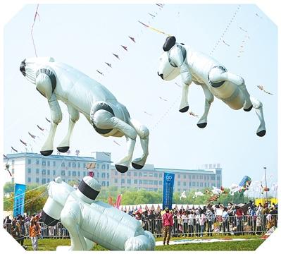 第43届潍坊国际风筝会万人风筝放飞活动上的机器狗造型风筝。