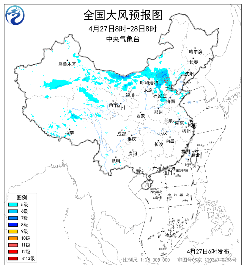 预计,4月27日08时至28日08时,内蒙古中西部、山西东北部、河北北部和西部、北京、天津、辽宁中西部、山东东部等地部分地区有6~8级风,阵风8~10级,局地阵风可达11级以上。