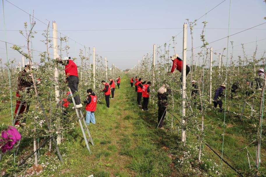 当前正值果树疏花、田间管护的关键时期,在镇村农技人员的专业指导下,志愿者们迅速投入助农生产一线,严格按照果园精细管护标准,与果农一道分工协作,高效有序进行果树疏花等工作,有效缓解了农忙时节劳动力短缺的实际难题。“这群年轻人上手快,干农活一点不差”,果农笑着竖起大拇指。
